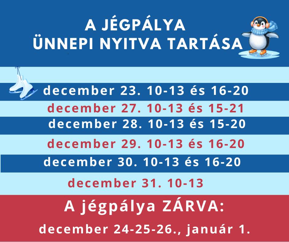 Tájékoztatjuk a kedves látogatókat, hogy a jégpálya ünnepi nyitvatartása a lenti tájékoztató szerint alakul.
